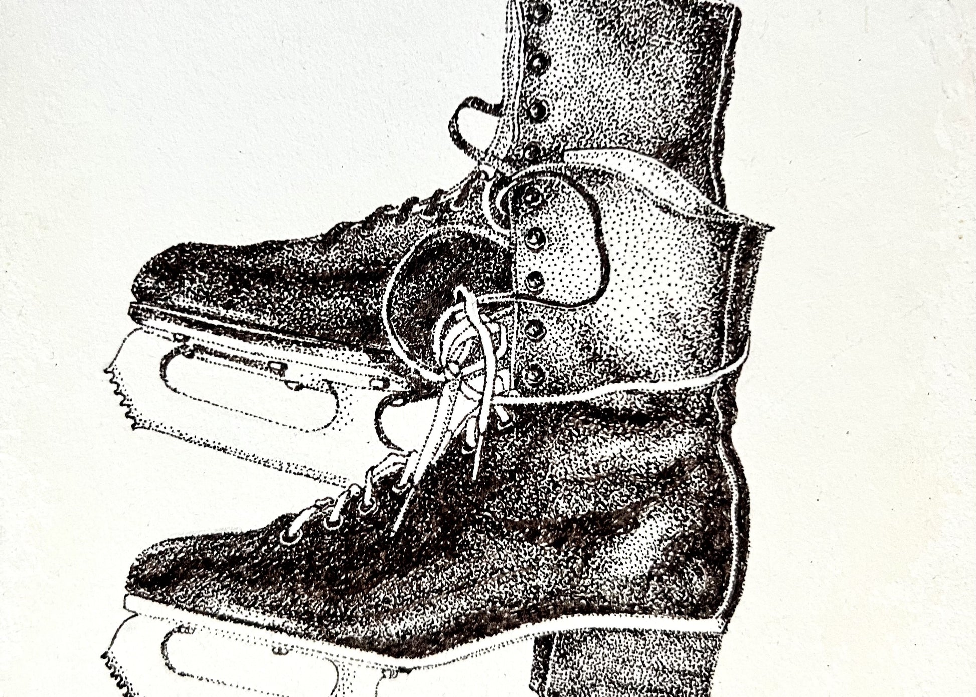 A pen-and-ink drawing of my pair of men's ice skates rendered sometime in the 1980s while I lived in New York City and trained in figure skating.
